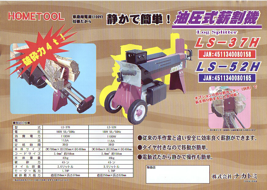 株式会社ナカトミ 油圧式薪割り機 SL-37H 価格: 52,500円 レビュー評価: 0.0 レビュー数:0 家庭用電源を使い静かで簡単操作のうちに薪が割れる。基本的に薪を2分割できます。本体重量は40キログラムを超えますが2輪のタイヤがついていますので移動も楽です。晴れた日に庭先での薪割など気持ちいいかもしれません。モーターは1.7馬力で破砕力は4トンを誇ります。破砕最大能力:直径250mm×長さ370mm。100ボルト使用の薪割り機。静かで簡単操作!破砕力4トン。タイヤ付で移動がらくらく。電動式で早くて安全。 Supported by 楽天ウェブサービス |